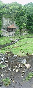 写真5:望月橋上流側(南方向)の岩壁に張りついた弁天窟