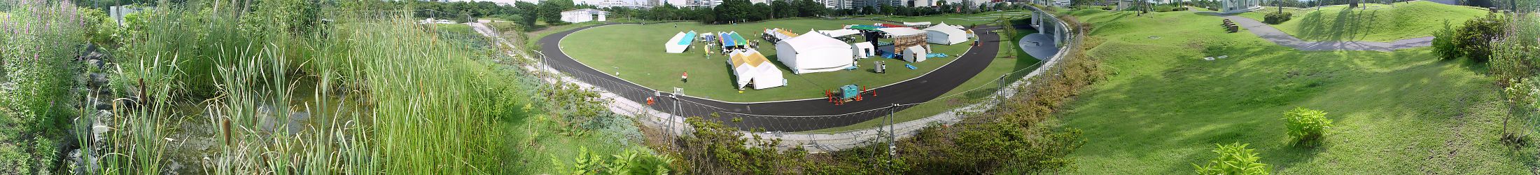 写真13 (360度) 水の流れがある池、広場では「多摩の物産&輸入品展」が開かれていた。