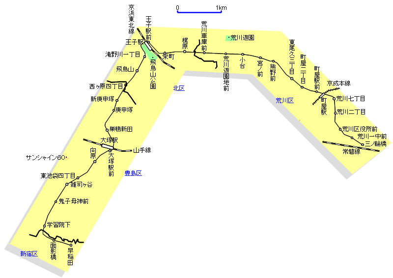 | グーグルアース座標(早稲田駅)=N35 42 42.58 E139 43 8.32 (三ノ輪橋駅)=N35 43 55.62 E139 47 29.62 |